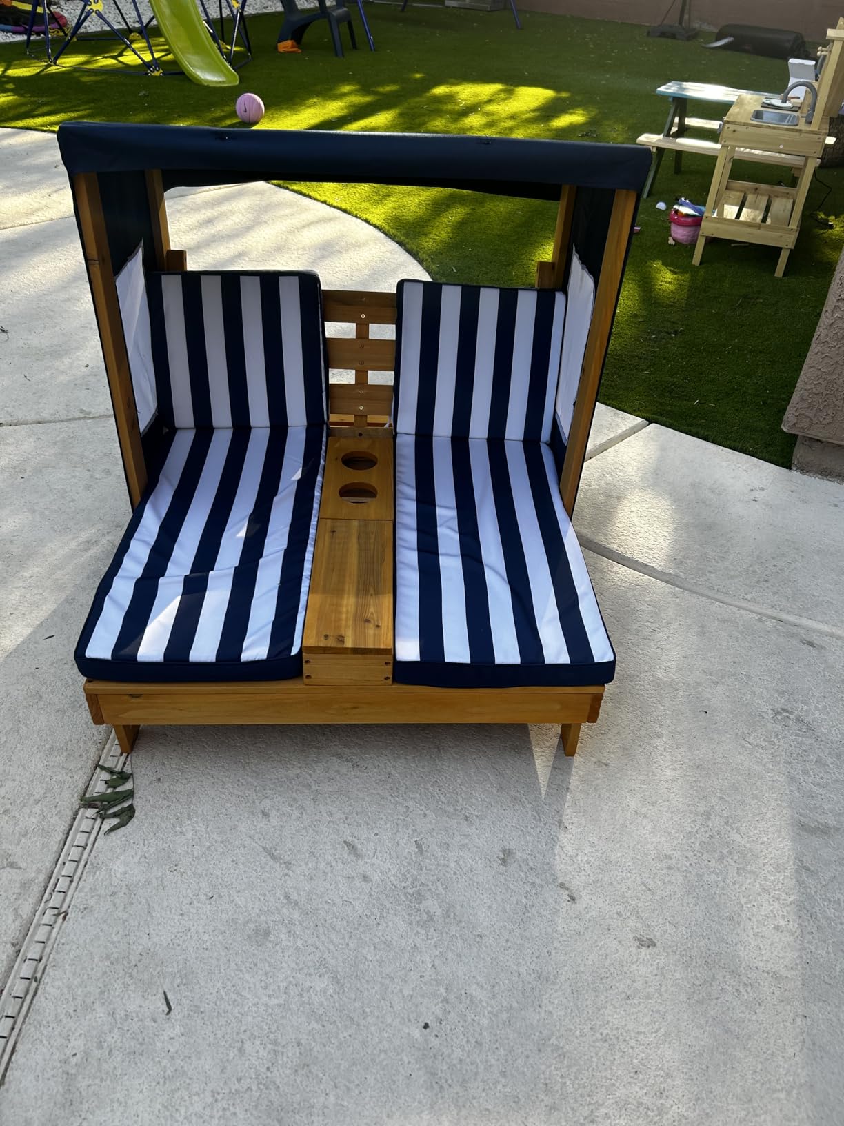 HONEY JOY’s Navy Blue Kids Chaise Lounge for 2 features a canopy, cup holders, and removable cushions. Durable wood construction is perfect for toddler backyard or poolside relaxation, ages 3+.