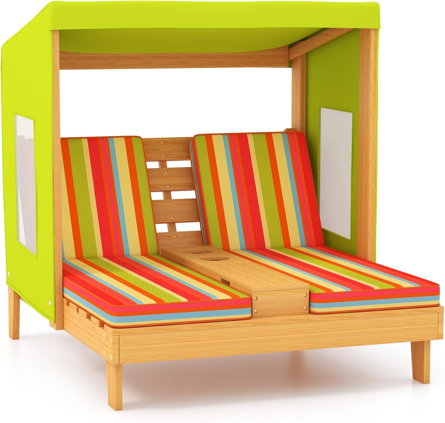HONEY JOY’s Light Green Kids Chaise Lounge for 2 offers a canopy, cup holders, and removable cushions. Sturdy wood design ensures toddler comfort for backyard or patio play, ages 3+.